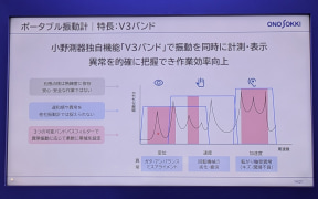 VW-3100では3つの「可変バンドパスフィルター」を使い、異なる周波数帯域の振動を同時に計測できる独自機能「V3バンド」を採用。各バンドで物理量のうち加速度、速度、変位のいずれかを選択して、実効値やピーク値などの演算も同時に行なえる。従来の振動計では物理量ごとに使用できる周波数帯域が固定されていたが、V3バンドの搭載によって異常振動に応じた柔軟な帯域設定が可能になり、異音の抽出や聴音、定量的な検出・評価がより正確になる。