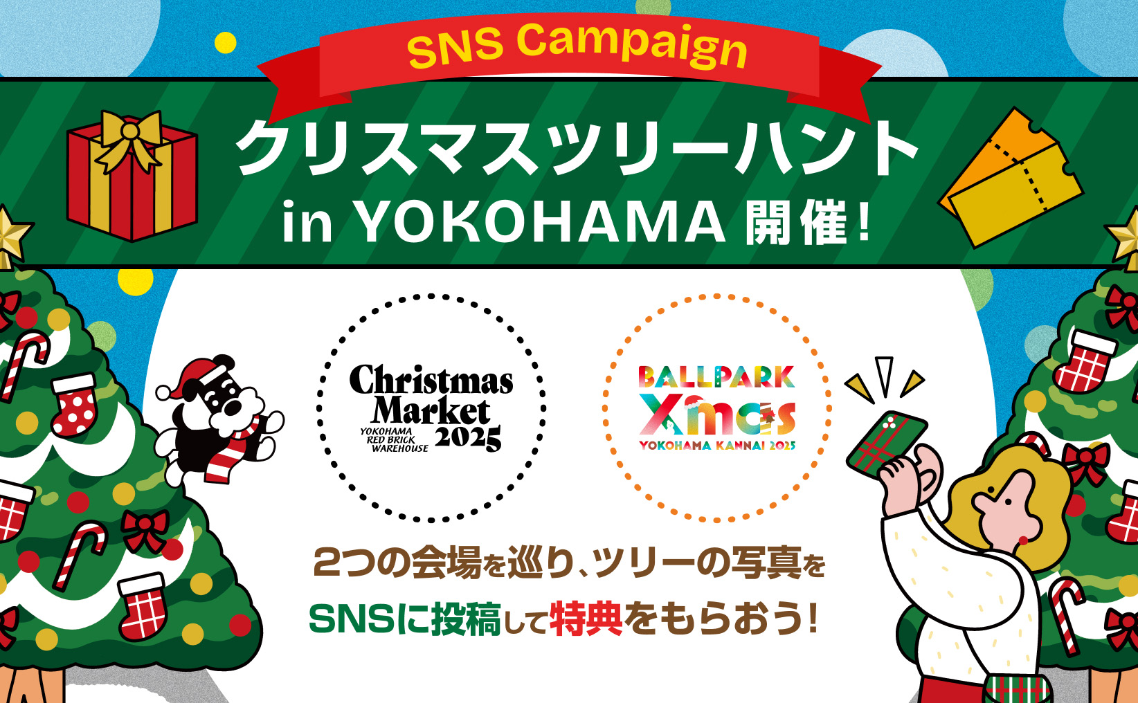 両会場の連携施策として「BALLPARK Xmas YOKOHAMA KANNAI 2025」「Christmas Market in 横浜赤レンガ倉庫」のメイン会場の2つの会場を巡り、それぞれの会場に設置されたクリスマスツリーを撮影してSNSに投稿すると、お得な特典がもらえるSNS投稿企画「クリスマスツリーハント in YOKOHAMA」を実施します。